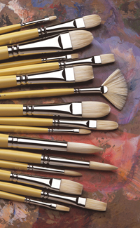 猪毛画笔是最适合油画颜料的画笔类型,它可以很好地匹配油画颜料自身的稠度与画布的粗糙纹理。不同形状的笔头可以绘出不同的笔触。平头笔是最常见的一种,它可以迅速而精确地进行涂刷。